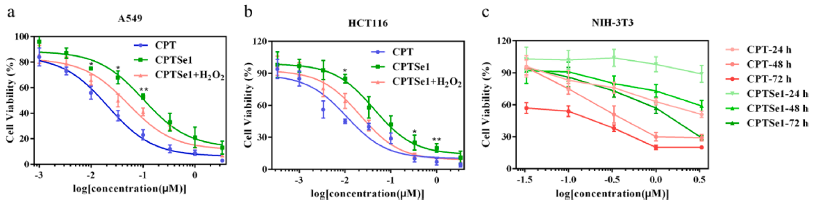 图3. CPT和前药CPTSe1在(a)A549和(b)HCT116癌细胞系中的抗增殖活性,(c)用CPT和前药CPTSe1预处理的NIH-3T3正常细胞系中的细胞活力。