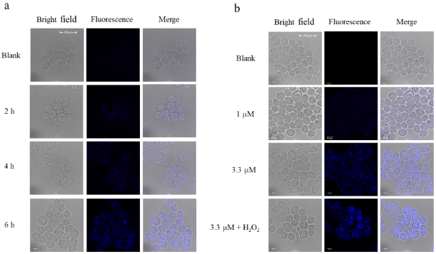 图2. (a) HCT116 细胞在CPTSe1缺失(Blank)和存在(10 μM)条件下的荧光共聚焦图,孵化时间分别为2, 4 或6 小时;(b) HCT116 细胞在CPTSe1缺失(Blank)和存在(1 μM或3.3 μM)条件下的荧光共聚焦图,孵化6小时;接着细胞用H2O2 (100 μM)处理和继续孵化 6小时。