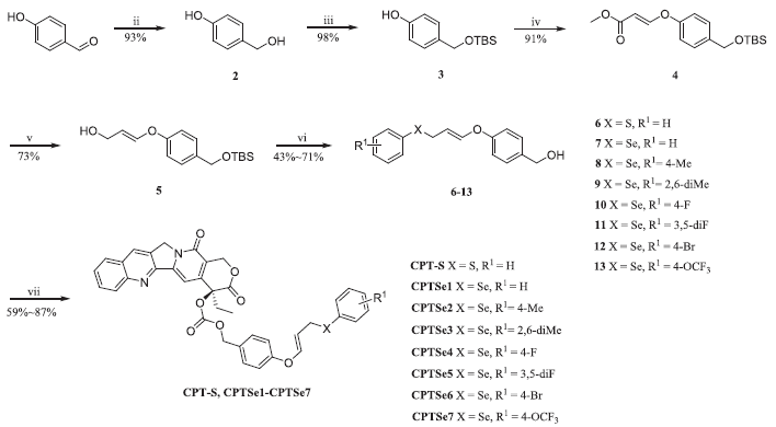 图1. 前药CPT-S和CPTSe1-CPTSe7合成路线图。