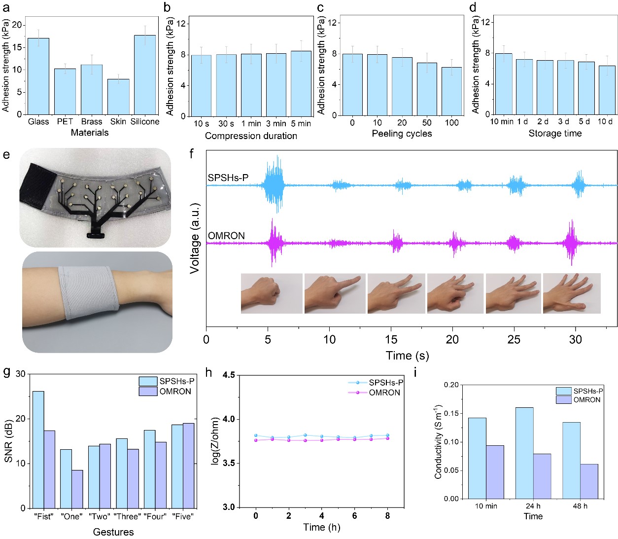 该具有独特的自合成异质结构的坚韧淀粉水凝胶,表现出了基于动态可逆氢键的抗疲劳能力。此外,这种生物水凝胶表现出对各种材料的即时和可逆的自粘附性和顺应性,确保了与皮肤之间形成无缝且稳固的粘合界面。文章展示了该水凝胶被应用于可穿戴应变传感器和皮肤生物电极,在宽应变范围内表现出高灵敏度的力学信号输出和高信噪比的肌电信号输出,且电学性能具有长期稳定性。该多功能纯淀粉水凝胶是完全可生物降解的,为紧密的人机界面提供了绿色和可持续的解决方案。