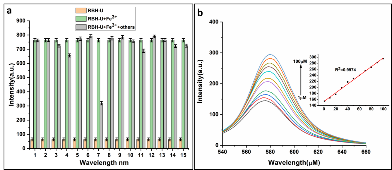 图1:(a).在Fe3+ (100μM)存在下,滴加不同的金属离子(100μM)在RBH-U (5μM)探针上的荧光强度变化。1 = Ag+ ,2 =Al3+ ,3=Ca2+, 4 = Cd2+, 5 = Cr2+, 6=Cr3+, 7 = Cu2+, 8= Fe3+, 9=K+, 10 = Li+, 11 = Mg2+, 12 = Mn2+, 13 = Na+, 14 = Ni2+, 15 = Mixture; (b).不同的Fe3+离子(1-100μM)在RBH-U (5μM)探针上的荧光强度变化。备注:λem=580nm 和 λex=515nm.