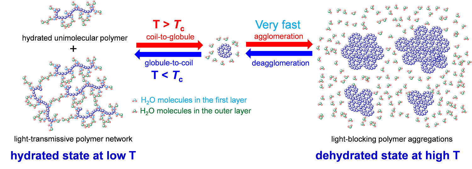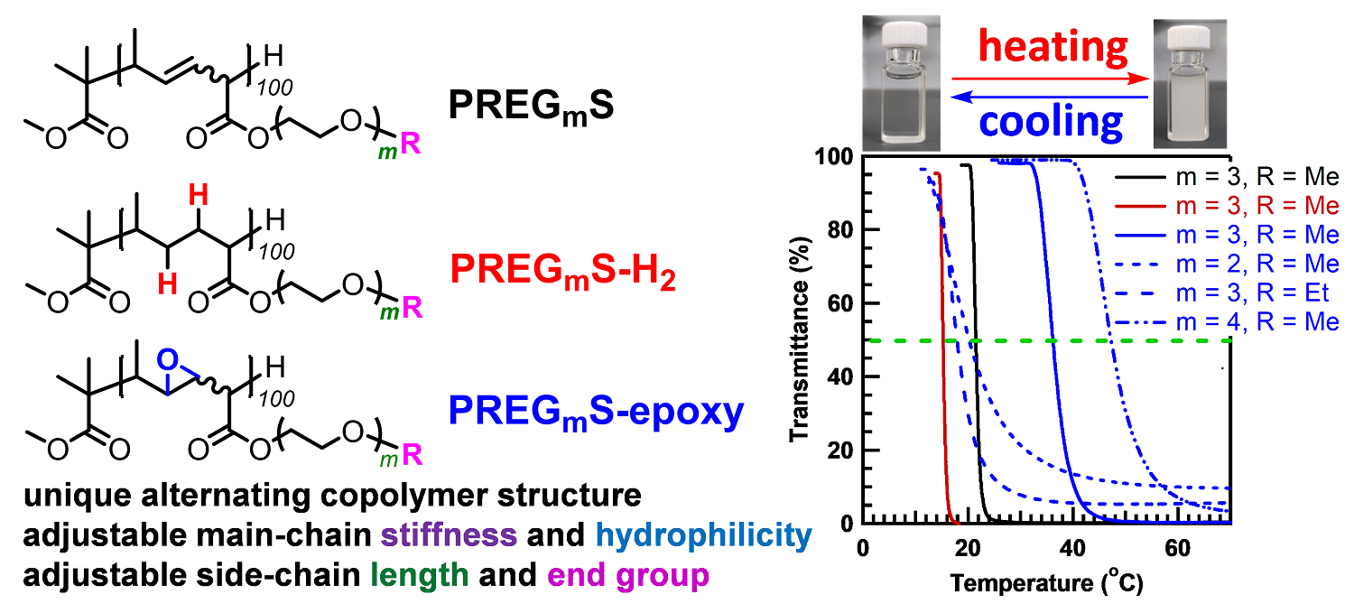 研究发现:聚[寡聚(乙二醇)山梨酸酯](PREGmS)或其氢还原聚合物的相转变行为几乎与聚合物的分子量无关,略依赖于其质量浓度,但高度依赖于侧链或主链的间距和长度,以及寡聚(乙二醇)侧链的端基。 有趣的是,具有疏水主链的PREGmS及其氢还原聚合物的浊点与侧链中氧含量呈线性关系,而具有亲水主链的环氧化聚合物显示另一种线性关系。此外,疏水主链聚合物对侧链含氧量的依赖性更为明显。