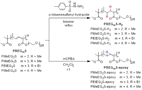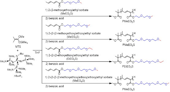 图1. 寡聚(乙二醇)山梨酸酯的有机催化的基团转移聚合及聚合物主链修饰