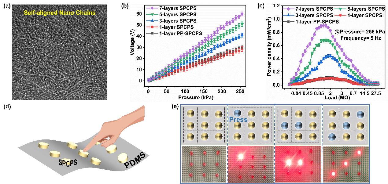 (a) 有序链状纳米纤维;(b) 自供电圆形压力传感器的输出电压与压强的关系;(c) 自供电圆形压力传感器的功率密度与负载电阻的关系; (d) (3×3)实时发光触觉传感器阵列示意图; (e) 按下相应的触觉传感器时对应的LED灯亮的照片