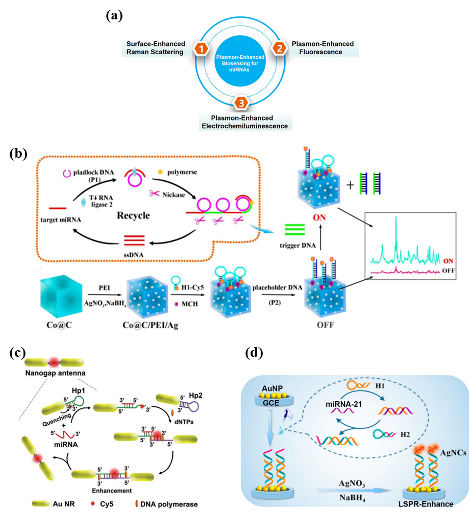 深圳大学高等研究院李正研究员近年来专注等离子体增强光学传感技术(图a)的开发,受著名分析化学期刊Biosensors and Bioelectronics(IF=10.618,中科院化学/分析化学1区TOP)邀请,撰写题为“Plasmon-Enhanced Biosensors for MicroRNA Analysis and Cancer Diagnosis”的综述论文,对miRNA的分析方法进行深入概括和归纳。这些方法主要包括表面增强拉曼散射法(SERS,图b所示)、等离子体增强荧光法(PEF,图c所示)和等离子体增强电化学发光法(PEECL,图d所示)。文章主要阐述了miRNA检测的分子传感机理和纳米结构的等离子体增强基底的组装策略,对有酶和无酶核酸扩增技术分别与等离子体增强基底的结合方法进行了讨论,并强调了等离子体增强光学传感器在复杂样品中对多种miRNA同时分析和常见癌症(肺癌、乳腺癌等)的即时检测领域的应用潜力。检测设备微型化、检测模式多元化、数据分析集成化是未来该研究方向发展趋势。