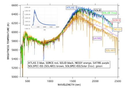 图2,将七个太阳光谱辐照度模型序列代入普朗克黑体辐射定律,计算出太阳表面的亮温分布图;左上角小图给出了典型的太阳光谱辐照度,其主要能量集中在~525nm的可见谱段。