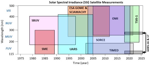 图1,七十年代以来太阳光谱辐照度天基测量任务。SSI的观测覆盖了从极紫外、紫外到近红外谱段。SSI仪器主要搭载火箭、航天飞机、国际空间站和近地低轨卫星进行天基连续太阳光谱辐照度测量,Tom Woods (LASP)供图。