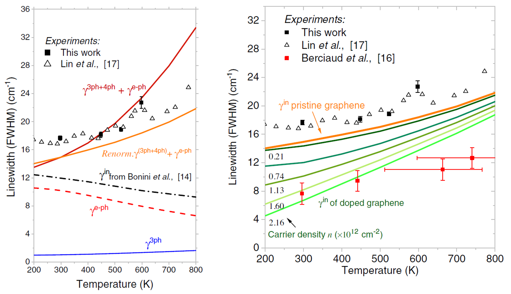 左图是三声子、四声子和电声耦合对石墨烯拉曼G峰线宽的贡献以及声子重整化的影响;右图是不同电子浓度下拉曼线宽随温度的变化。