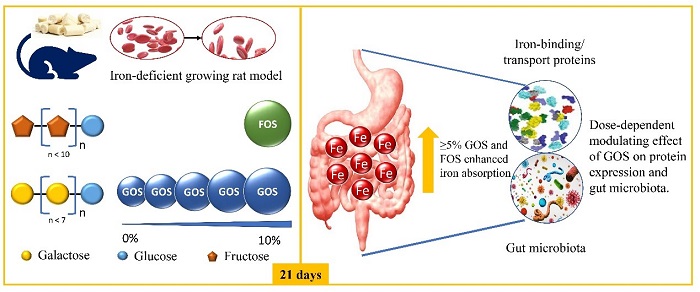 研究立足于目前严重危害我国少年儿童健康的缺铁性贫血问题,以生长期缺铁性贫血大鼠模拟儿童贫血,探究低聚果糖(FOS)和低聚半乳糖(GOS)在不同浓度状态下对大鼠肠道铁吸收的影响(图1)。研究旨在从蛋白表达和肠道菌群的角度探讨GOS如何影响缺铁生长大鼠模型铁吸收的机制,并确定GOS的最佳剂量。本研究首先喂养幼鼠缺铁饮食14天,建立缺铁动物模型。随后向缺铁大鼠提供标准大鼠饲料,辅以 0%、3%、5%、10% GOS 和 10% FOS,持续 21 天。结果表明,在饮食中添加≥5% GOS 可改善缺铁大鼠铁状态并显著影响铁结合/转运蛋白的表达。此外,研究结果确定了 GOS 对肠道菌群的剂量依赖性调节作用。本研究首次提供证据表明 GOS 补充剂在已建立的模型中对铁吸收和肠道菌群产生量效关系,证明GOS 在铁吸收和利用调控方面有积极作用,为益生元添加剂的选择提供参考依据。