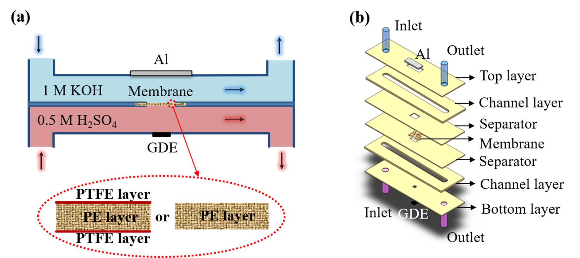 图1 双电解液铝空气微流体电池的示意图(a)和装配图(b)