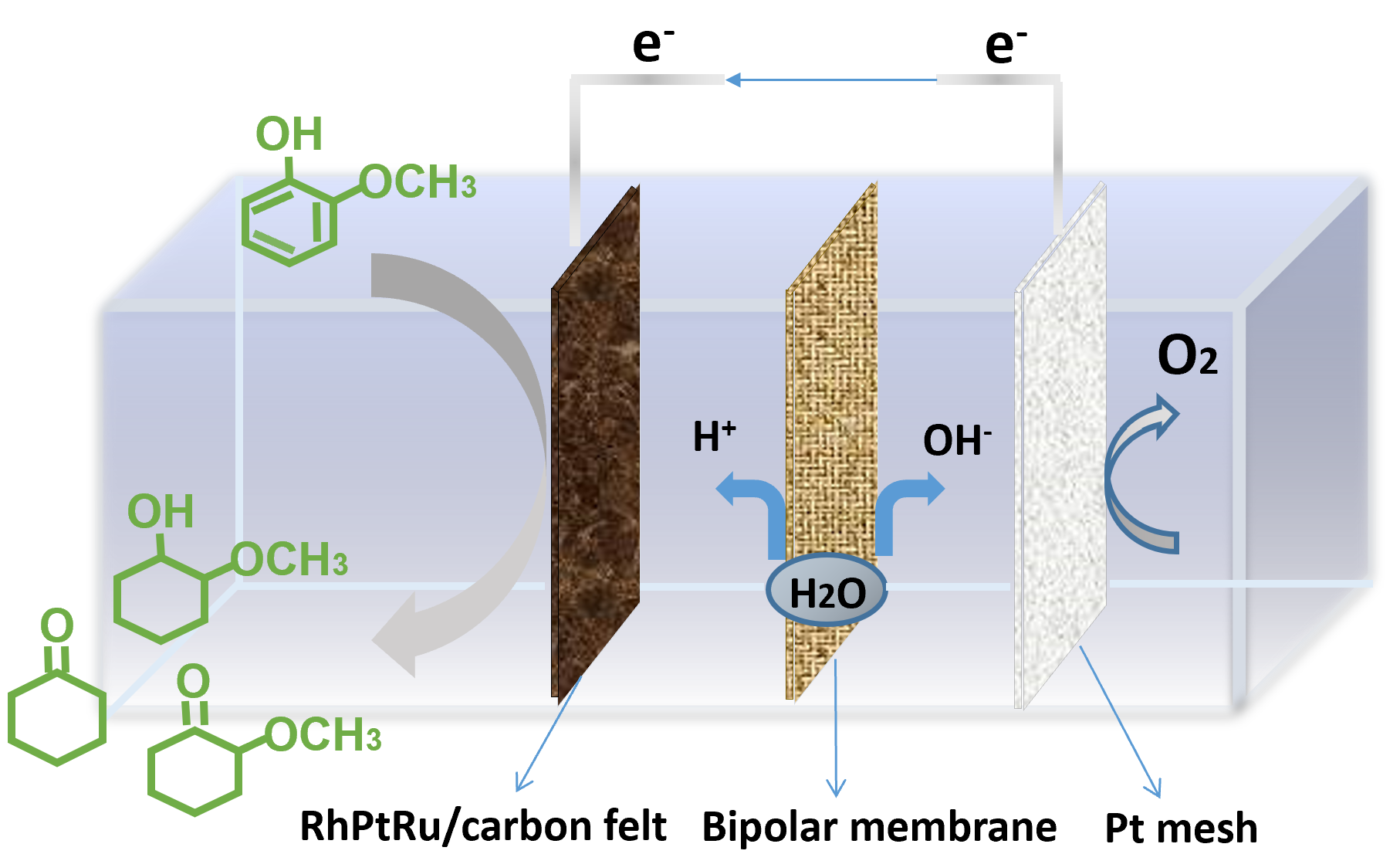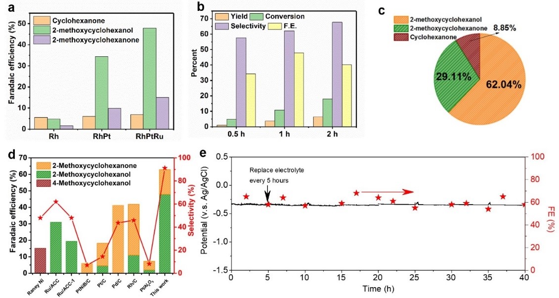 生物质木质素是一种丰富的可再生有机碳来源,将其转化为有附加值的有机化学物质有助于降低对化石资源的依赖。由木质素解聚而成的木质素单体包括甲氧基芳香化合物,可作为可再生原料用于生产用于制药的甲氧基环己烷衍生物,利用可再生电力驱动下电催化方法升级木质素单体为高附加值产品吸引了极大的研究兴趣。该研究报道了一种将木质素单体加氢生成甲氧基环己醇和甲氧基环己酮的高效电催化系统,该系统采用了新型三元RhPtRu电催化剂,和双极膜分隔的H-cell电解池。实验结果显示,该电催化系统在电流密度为50 mA cm−2时,木质素单体加氢合成2-甲氧基环己醇和酮的法拉第效率达到62.8%,选择性为91.2%