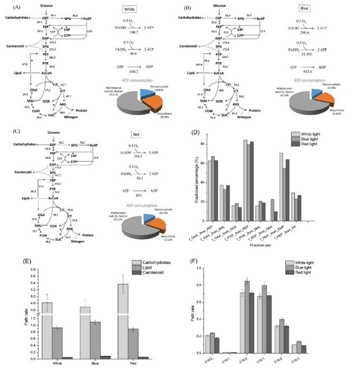 (图:不同光质条件下微藻的中心碳代谢、回补路径和产物的前体速率)
