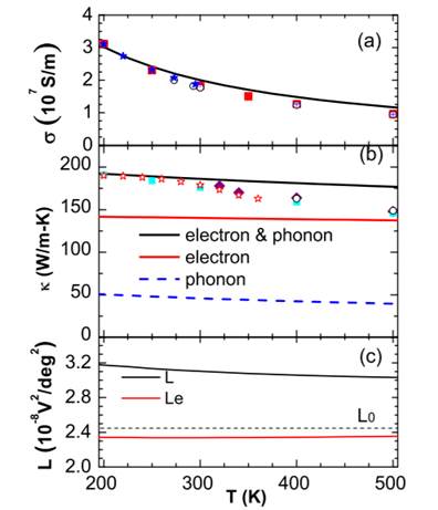 图注:(a)电导率,(b)热导率,(c)Lorenz数