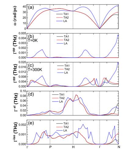 图注:高对称方向的(a)声子色散,(b)绝对零度时非简谐散射导致的线宽,(c) 室温时非简谐散射导致的线宽(d) 电子散射导致的线宽(e) 同位素散射导致的线宽