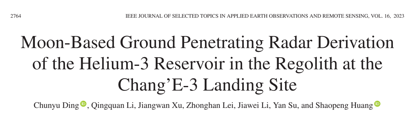 研究团队以题为《Moon-Based Ground Penetrating Radar Derivation of the Helium-3 Reservoir in the Regolith at the Chang’E-3 Landing Site》的研究成果发表于行星遥感领域权威期刊IEEE Journal of Selected Topics in Applied Earth Observations and Remote Sensing(JCR-Q2;影响因子:4.734)之上。深圳大学高等研究院为第一完成单位;嫦娥四号任务科学研究核心团队成员、高等研究院丁春雨研究员为第一作者和共同通讯作者;土木工程学院黄少鹏教授为共同通讯作者,深圳大学李清泉教授、国家天文台苏彦研究员以及国家航天局探月与航天工程中心高级工程师李佳威博士等为合作者。