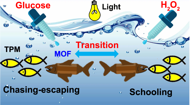微生物常通过趋化相互作用而呈现出追逐-逃避和群聚等有趣行为。尽管已有人造系统展现类似仿生行为,但通过控制趋化相互而实现不同集体行为之间的转换却较为少见。在此工作中,高永祥团队发展了以葡萄糖和双氧水为燃料的纺锤状金属有机骨架(MOF)自推进光敏胶体马达。在不同燃料中,该马达显示出不同的趋化作用,可用于调控马达与惰性胶体混合体系的集体动力学:在葡萄糖和双氧水中分别表现为 “追逐-逃逸”和群聚行为。该行为的转变被归因于引起趋化的离子扩散泳作用方向的改变。该研究为调控胶体马达和惰性胶体之间通信提供了新的策略,对于活性物质基础研究和货物运输、化学传感等应用研究均有重要意义。