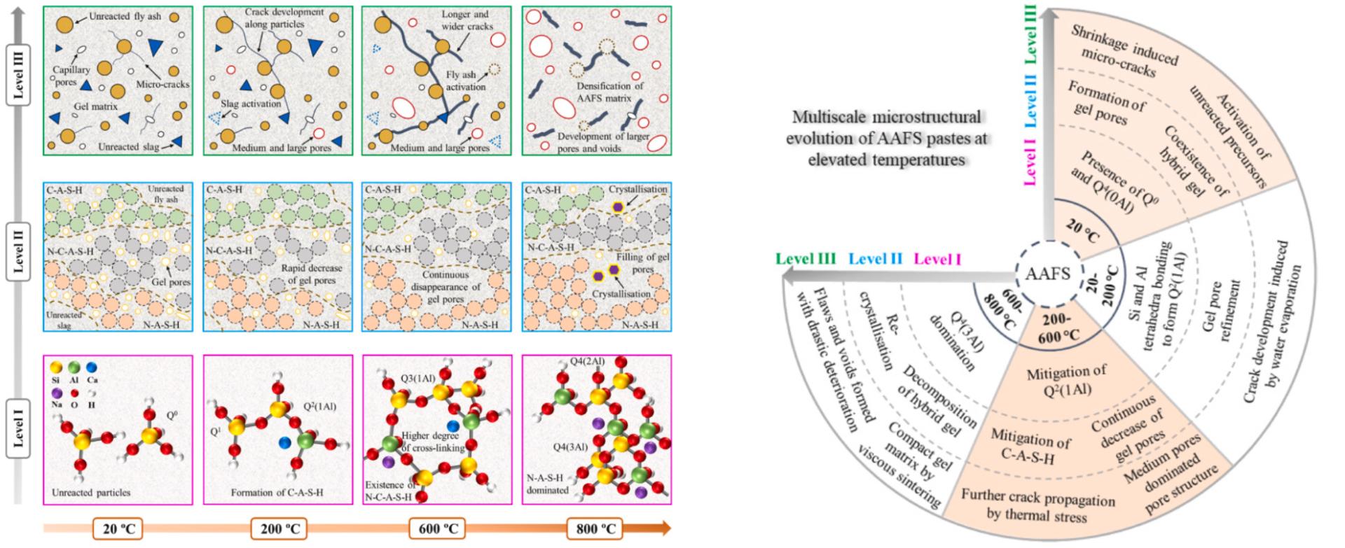 碱激发材料(AAM)被认为是替代波特兰水泥(PC)的潜在选择之一,因为它们不仅在制造过程中导致60-80%更少的CO2排放,可以提高建筑材料的可持续性,而且还具有优越的热稳定性和耐高温性。近年来,碱激发材料在高温作用下的机械性能和热性能研究得到了越来越多的关注。然而,对于碱激发材料在高温作用下内部的化学反应机理和微观结构演变规律的研究甚少,缺乏系统深入的研究。本研究利用多尺度微观结构表征与分析方法,系统剖析碱激发材料在高温作用下微观结构的演变规律,探明其内部的劣化机理。本研究从多尺度的角度深入了解了碱激发材料在高温下的损伤机制,考虑了I级:固体凝胶颗粒、II级:凝胶基质和III级:浆体。研究结果表明,C-A-S-H和N-C-A-S-H凝胶在高温至800°C时填充,随着裂纹的形成,而微裂纹则通过熔化和粘性烧结愈合。