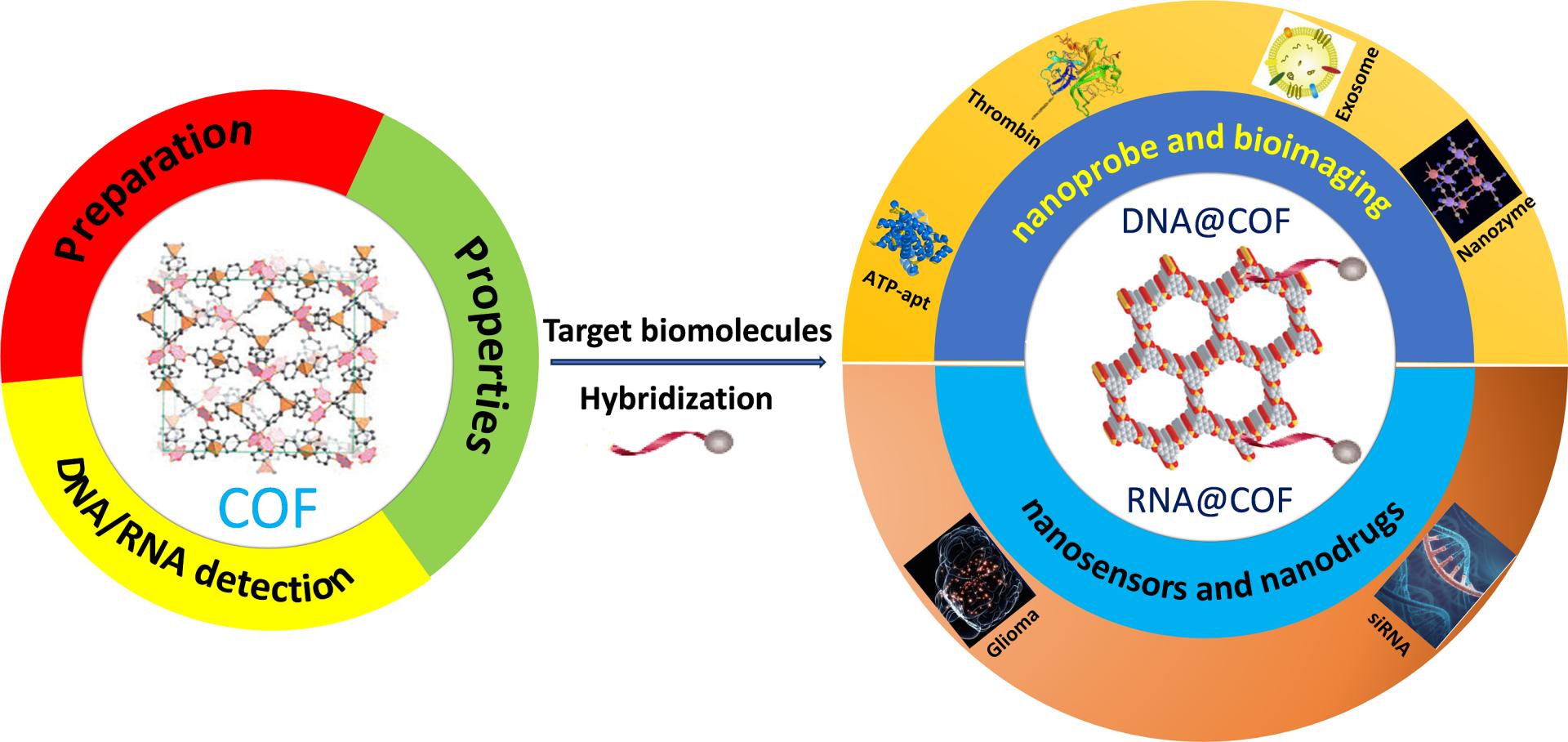 摘要图: DNA/RNA杂交的COF纳米探针在生物分析检测、临床生物医学和生物标志物成像等方面的潜在应用。