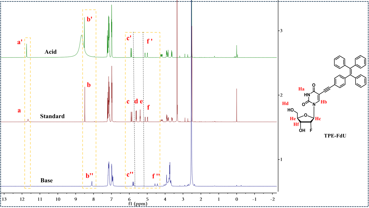 生物相容性荧光探针已成为生命科学中亚细胞结构可视化和特定分析物检测的重要工具。本文报道了一种新型荧光探针(TPE-FdU)的合成和表征,该探针含有亲水性2′-氟取代脱氧尿苷和疏水性乙炔基四苯基乙烯部分,具有典型的聚集诱导发射(AIE)行为。中性条件下的TPE-FdU(pKa 7.68)的作为参照,它在pH 4下表现出荧光增强四倍的450nm发射信号。当pH值增加到10时,荧光强度完全猝灭。TPE-FdU在酸性环境(纳米球形形态,AIE增强,pH=4)和碱性环境(微米棒,荧光猝灭,pH=9)中的TEM图像显示,这是一种pH依赖性的自组装探针。另外,在不同pH值下此TPE-FdU探针的NMR图中相同归属1H的ppm迁移等也证明了其自组装性质(图1)。