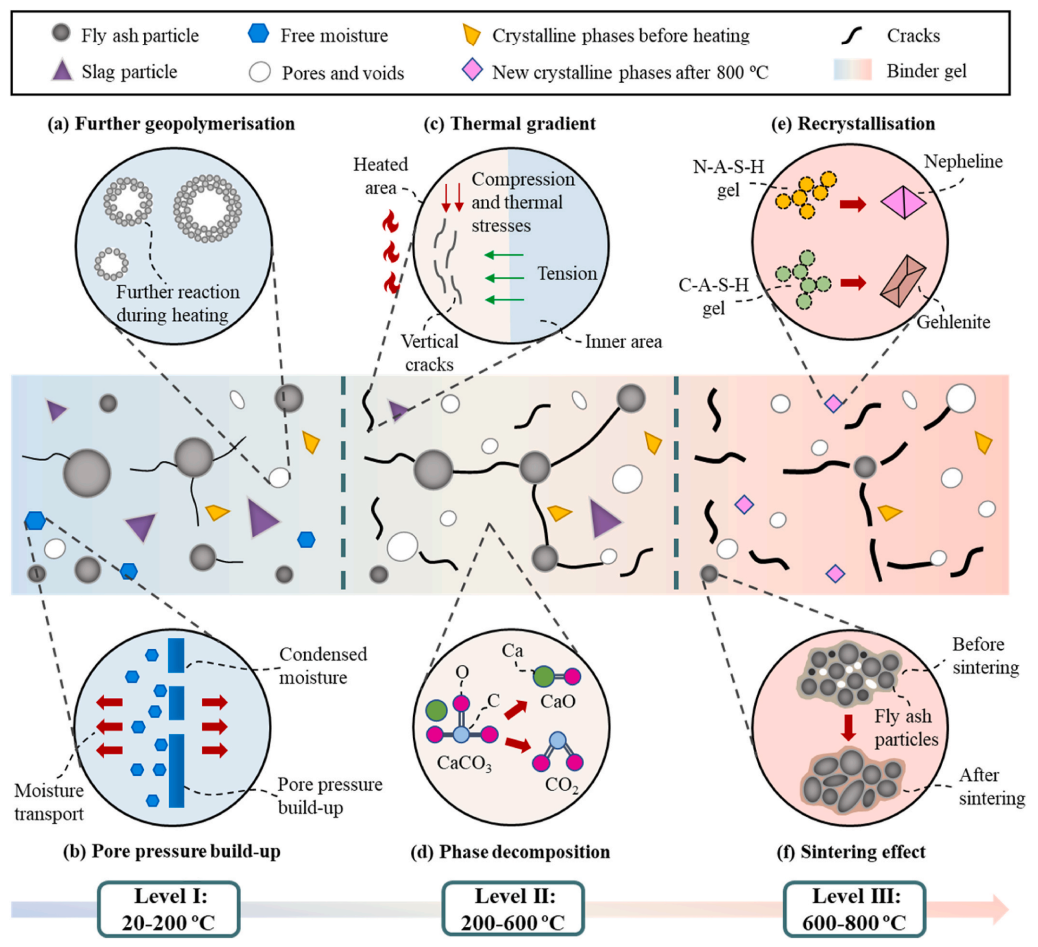 波特兰水泥是全世界最普遍使用的建筑胶凝材料,但是在水泥的生产过程中会排放出大量的二氧化碳,不利于生态环境的可持续发展。利用工业固废来制备新型的碱激发胶凝材料被誉为是一种有利于可持续发展的绿色低碳材料。在高温的作用下,碱激发胶凝材料会发生一系列化学反应、微观结构变化和微观力学的发展,从而影响整体的性能。针对该问题,本文采用XCT原位跟踪测试手段,系统探究在高温作用下,粉煤灰-矿渣基胶凝材料(AAFS)的化学反应、微观结构和微观力学的相互作用关系。研究表明AAFS胶凝材料的抗压强度在200°C时上升了77.5%,随后在200°C至600°C之间有所缓解,并在800°C时重新上升。AAFS胶凝材料中的不同相,包括未反应的颗粒、反应产物和孔隙,在室温下分别占30%、67.7%和2.31%,在800°C加温后分别为4.95%、84.8%和10.3%,表明发生了与钠长石和格林石形成有关的再结晶。