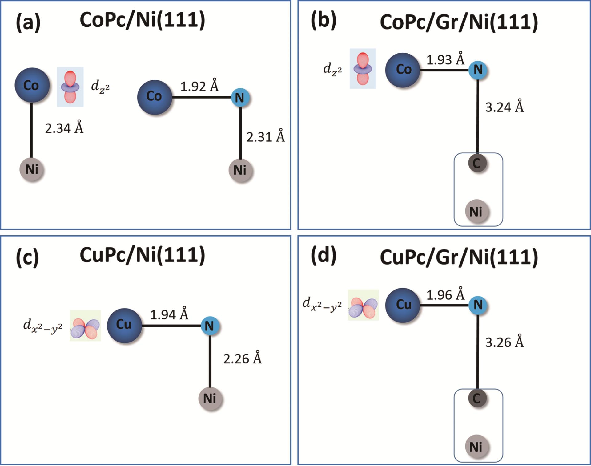 图1:TMPc/Ni(111)与TMPc/Gr/Ni(111) (TM=Co, Cu)体系中的磁交换相互作用机理示意图