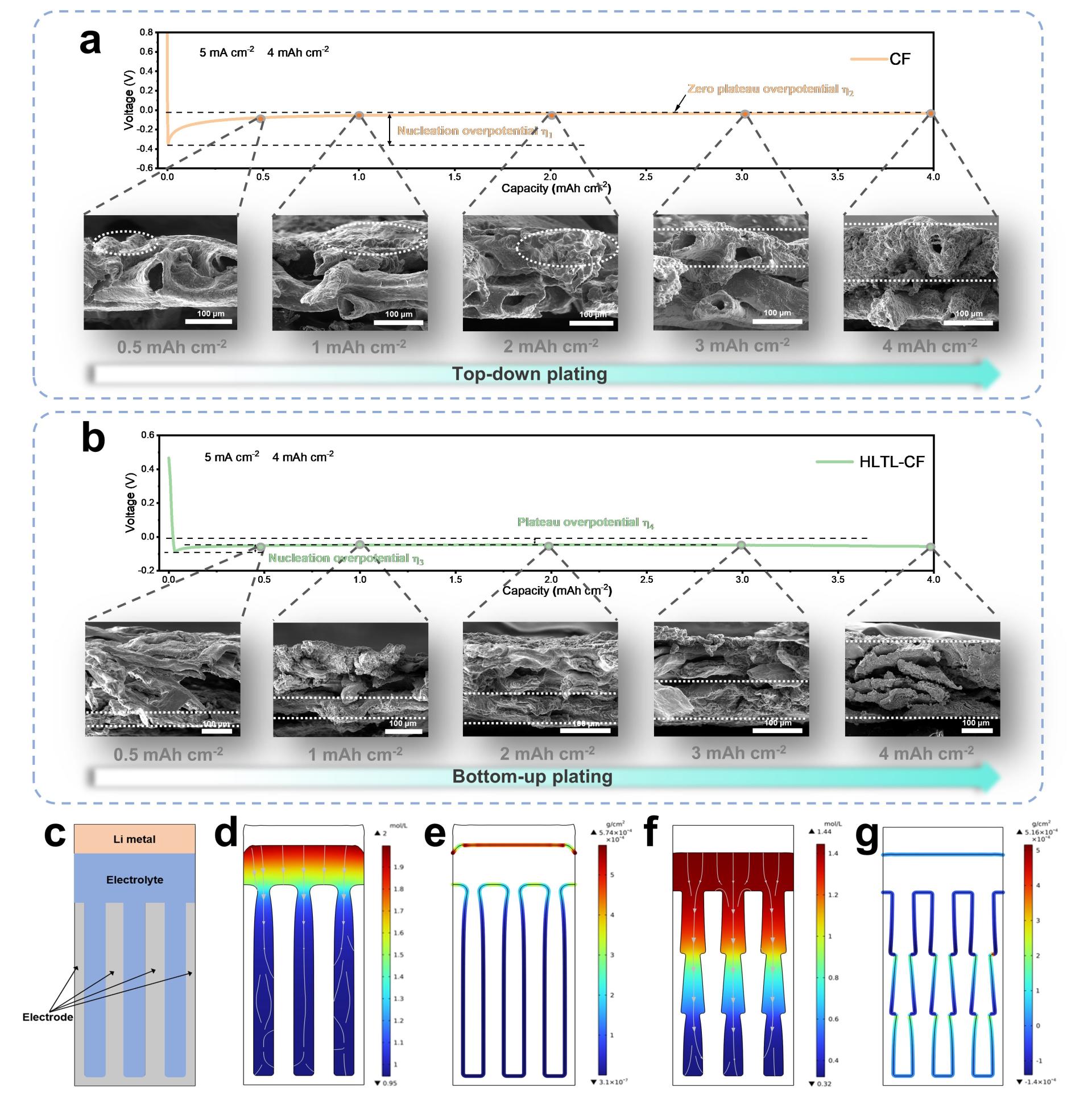 该研究将卷对卷制程以及溶液燃烧法相结合,制备了拥有多级亲锂结构的3D集流体。该制备方法具有简单、成本低等优势,易于大规模产业化。在锂金属电池中运用该集流体作为锂金属的附着基底,可使电池在循环过程中,锂金属沉积模式由自上而下转变为自下而上,以此大大提高其循环稳定性能以及安全性。