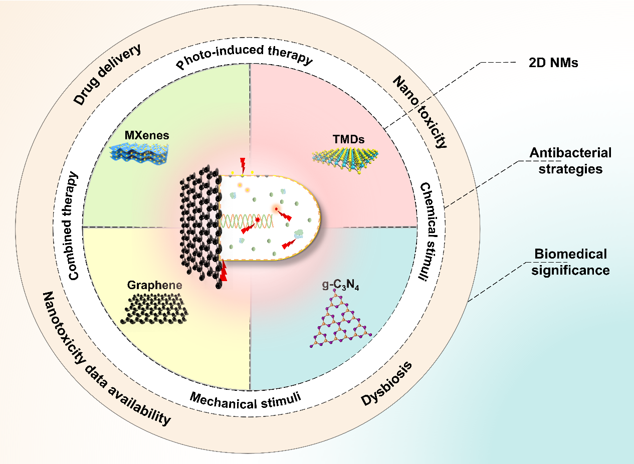图1: 概述基于抗菌机制不同的二维纳米材料的生物医学意义、微生态失调和细胞纳米毒性等。