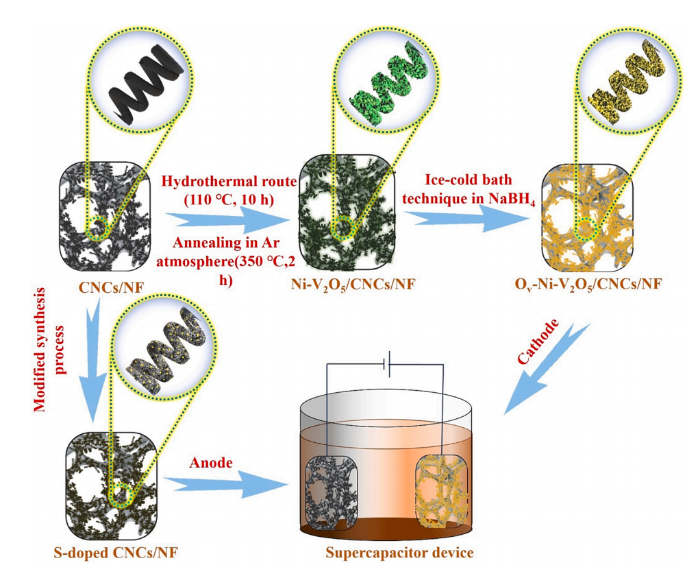 2024年3月13日,赵伟研究员团队在化学工程核心期刊《Chemical Engineering Journal》上发表了题为“Exploration of the role of oxygen-deficiencies coupled with Ni-doped V2O5nanosheets anchored on carbon nanocoils for high-performance supercapacitor device”的研究论文。超级电容器在大规模储能方面拥有巨大潜力,因此近年来对超级电容器电极材料的开发成为热门的研究主题。研究人员通常使用比电容、可逆性、循环稳定性和能量密度等标准来评估超级电容器电极材料的适用性,其中电极材料对电容器比电容的影响尤其大。