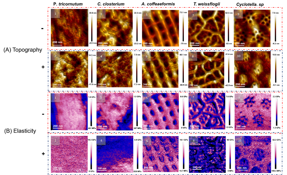 原子力显微镜下三角褐脂藻、新月细柱藻、威氏海链藻、咖啡双眉藻和小环藻的细胞表面形貌和杨氏模量示意图