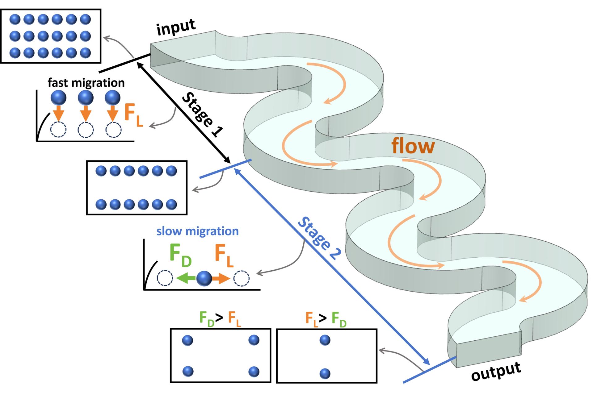蛇形流道耦合惯性流和二次流,可实现有效的颗粒聚焦和分离,在临床诊断和药物筛选中显示出巨大的潜力。然而,蛇形流道中的不稳定的二次流使得惯性迁移的演化不明确,阻碍了蛇形流道的发展和应用。为了完善惯性迁移机理,本研究建立了一个具有不同曲率比的模型,研究了二次流对蛇形流道中颗粒迁移的影响。该方法采用直接数值模拟计算惯性升力,将惯性升力映射到蛇形流道的横截面,并利用拉格朗日粒子跟踪方法破译惯性迁移。通过实验研究了颗粒的惯性迁移,验证了所建立的数值模型。结果表明,蛇形流道中的颗粒迁移遵循二阶迁移理论。增加二次流会加速第二阶段的迁移,并减慢第一阶段的迁移。此外,本文研究了雷诺数、截面高宽比和阻塞率等不同参数对粒子平衡位置的影响,为粒子的高分辨率分离提供了指导。在考虑到流动阻力的前提下,本文的无量纲研究使得任意大小的颗粒的分离成为可能。本研究揭示了蛇形流道中的迁移机制,为颗粒的惯性分离提供了新的契机。