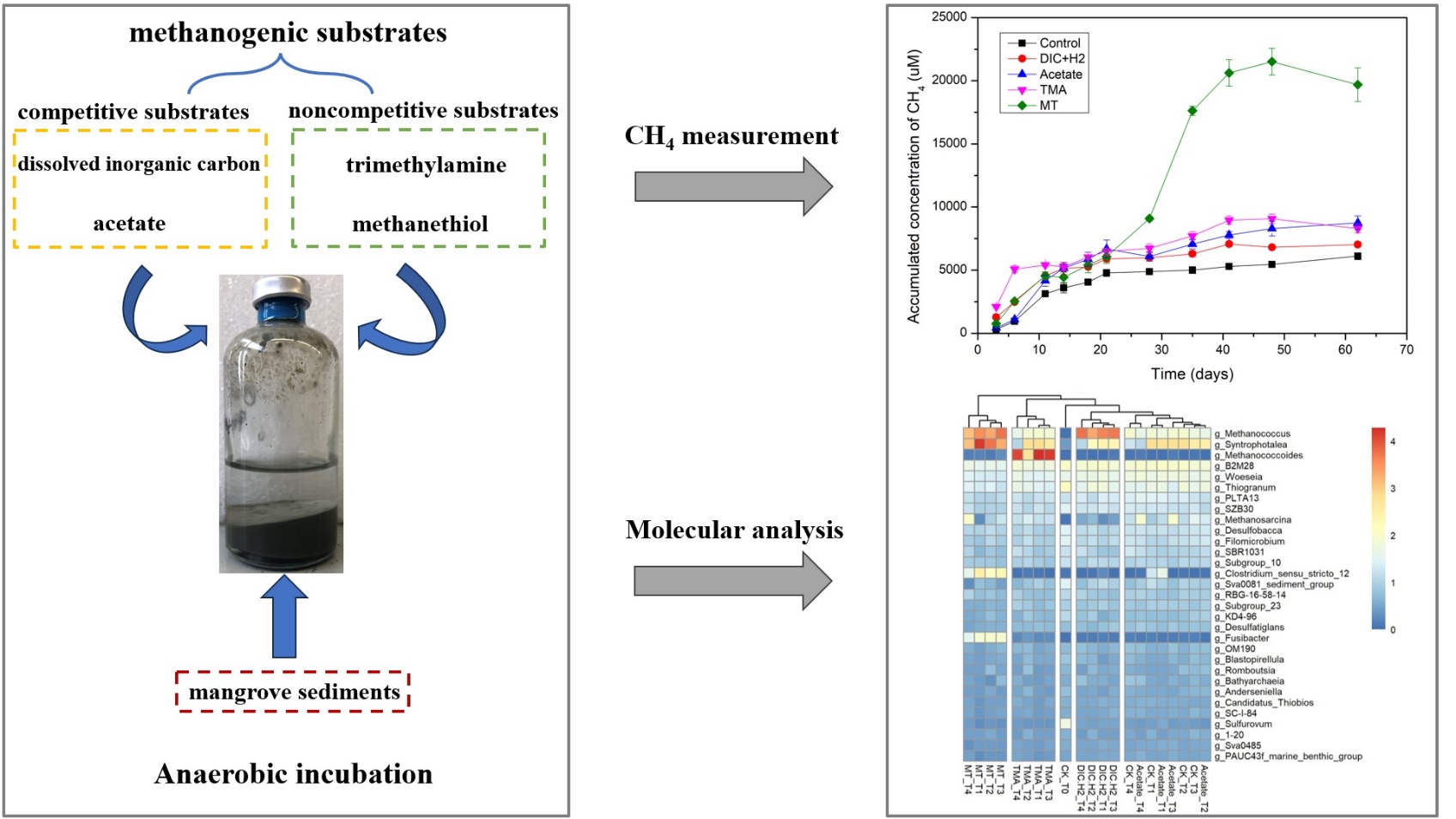该论文比较了不同类型的产甲烷底物对红树林沉积物甲烷排放的刺激效果及其对微生物群落结构的影响。重点关注各种底物刺激甲烷排放的快慢和甲烷总排放量,并探究各产甲烷类型下的关键产甲烷古菌。我们发现红树林沉积物中三甲胺最快速刺激甲烷排放,而甲硫醇虽然最慢却可刺激最大量的甲烷产生,并且这两类甲基底物刺激的甲烷产量都高于竞争底物碳酸氢钠和乙酸。此外,扩增子和宏基因组测序分析表明,在添加甲基底物的处理中产甲烷相关的微生物功能基因丰度更高。甲烷球菌目(Methanococcales)和甲烷八叠球菌目(Methanosarcinales)是最为关键的两类产甲烷古菌,突显出其在红树林湿地产甲烷中的重要生态功能。