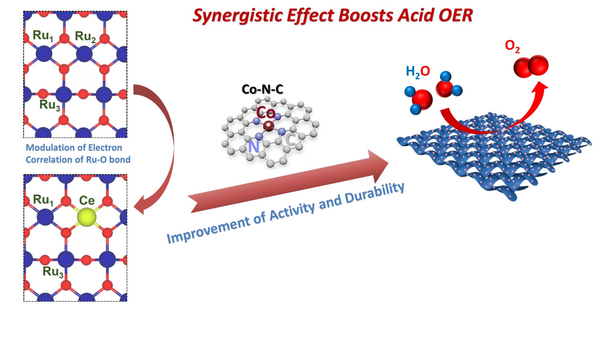 2024年10月1日,赵伟课题组在《Advanced Functional Material》上发表文章“Synergistic Engineering of Dopant and Support of Ru Oxide Catalyst Enables Ultrahigh Performance for Acidic Oxygen Evolution”。其中设计了铈掺杂纳米RuO2催化剂,并以Co-N-C作为支撑材料(Ce@RuO2/CoNC)进行酸性电解水析氧反应(OER),通过铈掺杂和Co-N-C作为支撑材料,优化OER中间体的自由能,抑制Ru的溶解,协同提高钌氧化物的活性和稳定性。该催化剂在10 mA cm−2下仅有150 mV的超低过电位,同时其稳定性达到了1000 h,优于之前报道的大多数Ru基催化剂。该文章由亥姆霍兹柏林材料与能源研究中心武斌、武汉理工大学麦立强、深圳大学赵伟为论文共同通讯作者,Felix博士作为第一作者,深圳大学高等研究院为第一完成单位。