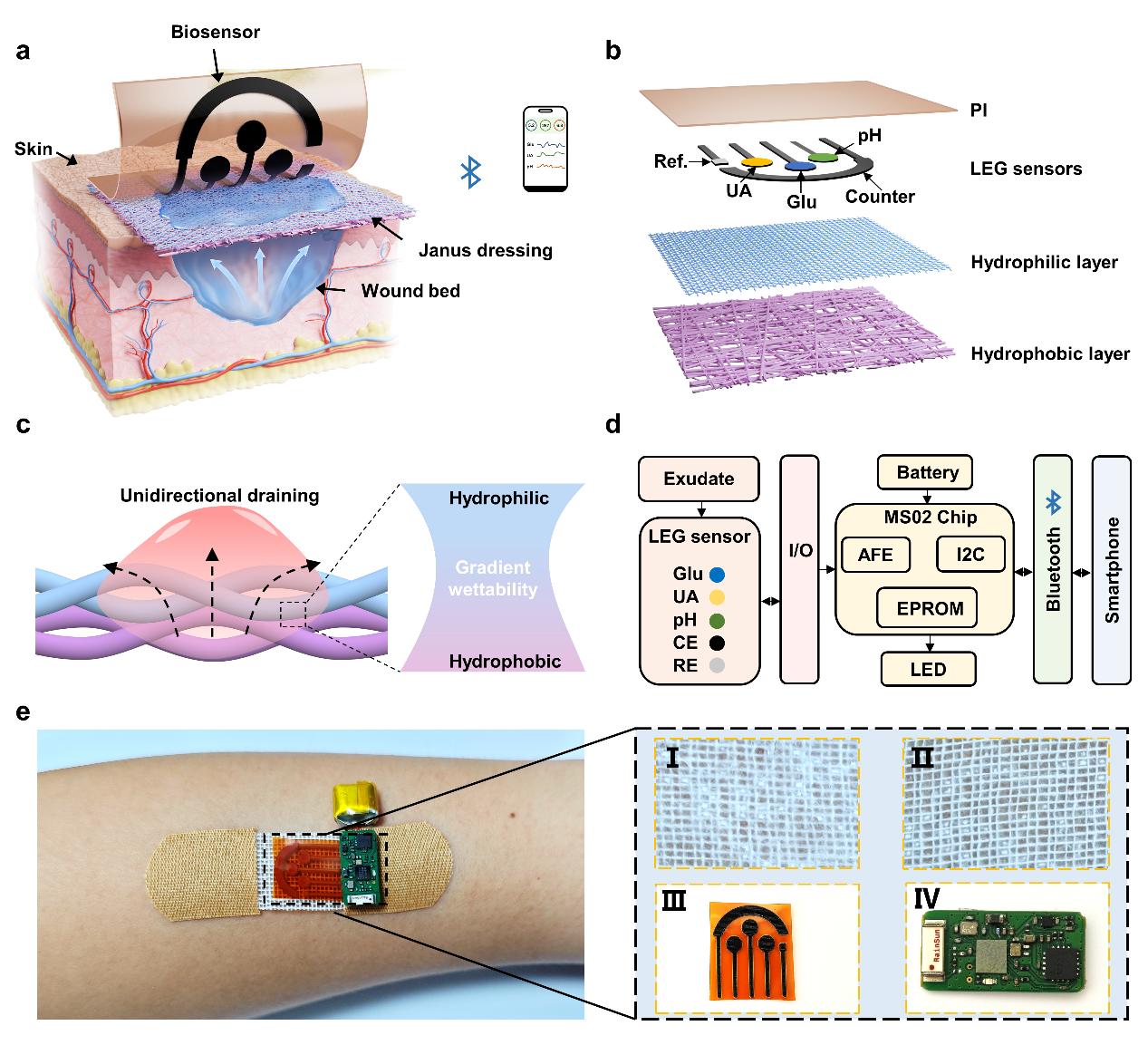 单一功能的伤口敷料对慢性伤口愈合的治疗效果有限,有效的慢性伤口护理需要满足集渗出液管理、治疗和持续监测于一体的多功能性。本研究介绍了一种集成的Janus生物电子伤口护理绷带(图1),旨在通过两侧具有相反润湿性的电纺Janus敷料实现自泵渗出液管理,引入银纳米粒子(AgNPs)实现抗菌特性,并通过在引流侧放置电化学传感器监测伤口中的多种生物标志物。传感器的检测限分别为葡萄糖0.15mM、尿酸6.85μM和pH(4-8)60.76mV/pH。通过在小鼠全层伤口模型中证明这种绷带有效促进了伤口愈合,第14天伤口闭合率达到90.35%,相对原始纱布愈合率提高了14.02%,并在3天内原位监测了伤口内三种生物标志物的动态变化。