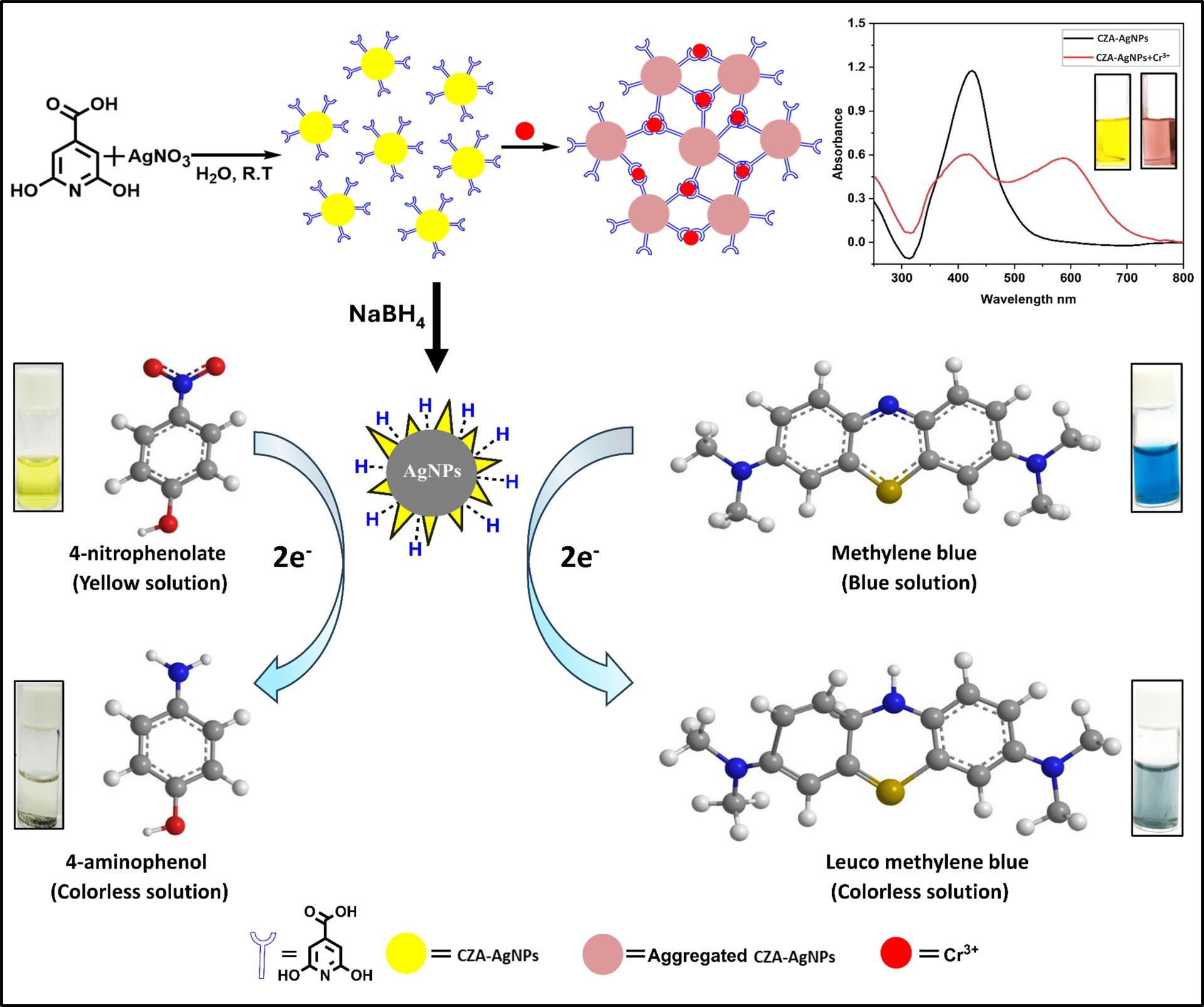 探针CZA-AgNPs与Cr3+、4-硝基苯酚或亚甲基蓝具有良好的协同结合,在Cr3+离子敏感检测、有效地用作可重复使用的环境污染物催化剂(4-硝基苯酚,亚甲基蓝)等方面被证明了“一石三鸟”的多功能性,对环境监测和公共卫生倡议等具有重要帮助。