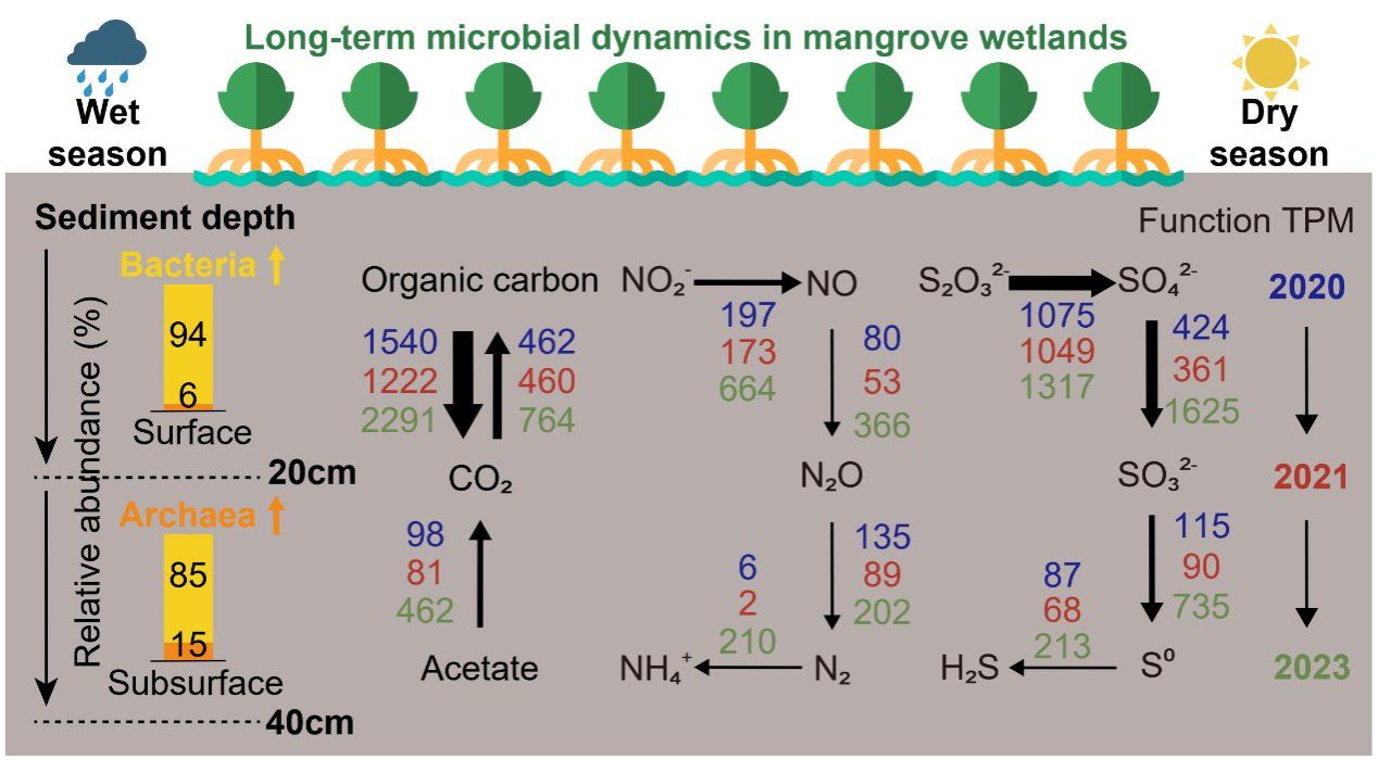 摘要图:红树林湿地微生物群落与功能潜力的七年时空动态