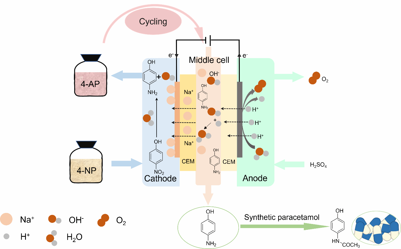 随着反应进行,阴极室内产生的4-氨基酚与氢氧化钠形成混合溶液,该溶液随后被引入中间室继续循环。在电场驱动下,钠离子不断从中间室“穿梭”回阴极室,而中间室内的氢氧根离子则被持续中和。经过循环后,中间室内得到的是高度纯净的4-氨基酚溶液,电解质含量显著降低,分离效率高达99.8%。同时后续反应的电解质均由前一轮反应提供。大大降低了电解质的使用。