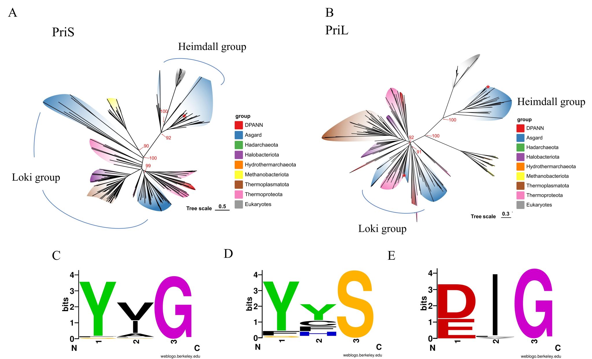 作为生命演化研究的核心命题之一,真核生物的起源始终备受科学界关注,阿斯加德古菌的发现为这一问题的研究注入了新的活力。而DNA复制机器作为连接古菌与真核生物的关键分子证据,其中引发酶(由催化亚基PriS和非催化亚基PriL组成)的演化历程更是解开这一谜团的重要钥匙。团队发现阿斯加德古菌的引发酶可明确划分为两个演化分支:海姆达尔群(Heimdall group)和洛基群(Loki group)(图1)。其中,海姆达尔群引发酶与真核生物引发酶具有更显著的相似性,而洛基群则更接近其它非阿斯加德古菌的引发酶。这一分类为追溯真核生物引发酶的起源提供了清晰的框架。结构分析揭示海姆达尔群PriL亚基的C端包含三个连续的α-螺旋,可稳定铁硫簇,这一结构与真核生物PriL高度一致,而洛基群及其他古菌均无此特征。