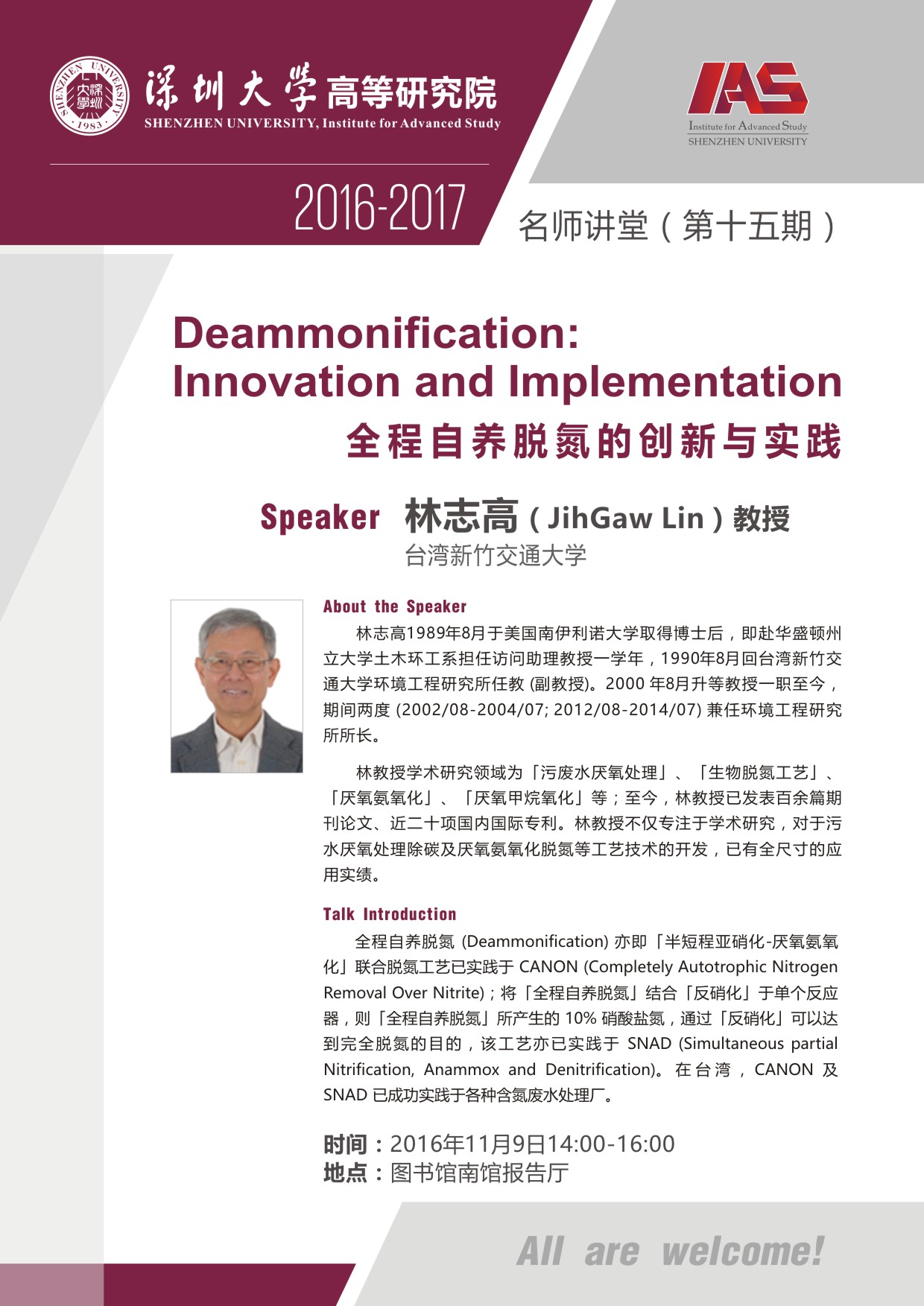全程自养脱氮(Deammonification) 亦即「半短程亚硝化-厌氧氨氧化」联合脱氮工艺已实践于 CANON (Completely Autotrophic Nitrogen Removal OverNitrite);将「全程自养脱氮」结合「反硝化」于单个反应器,则「全程自养脱氮」所产生的 10% 硝酸盐氮,通过「反硝化」可以达到完全脱氮的目的,该工艺亦已实践于 SNAD (Simultaneous partial Nitrification,Anammox and Denitrification)。在台湾,CANON及 SNAD 已成功实践于各种含氮废水处理厂。