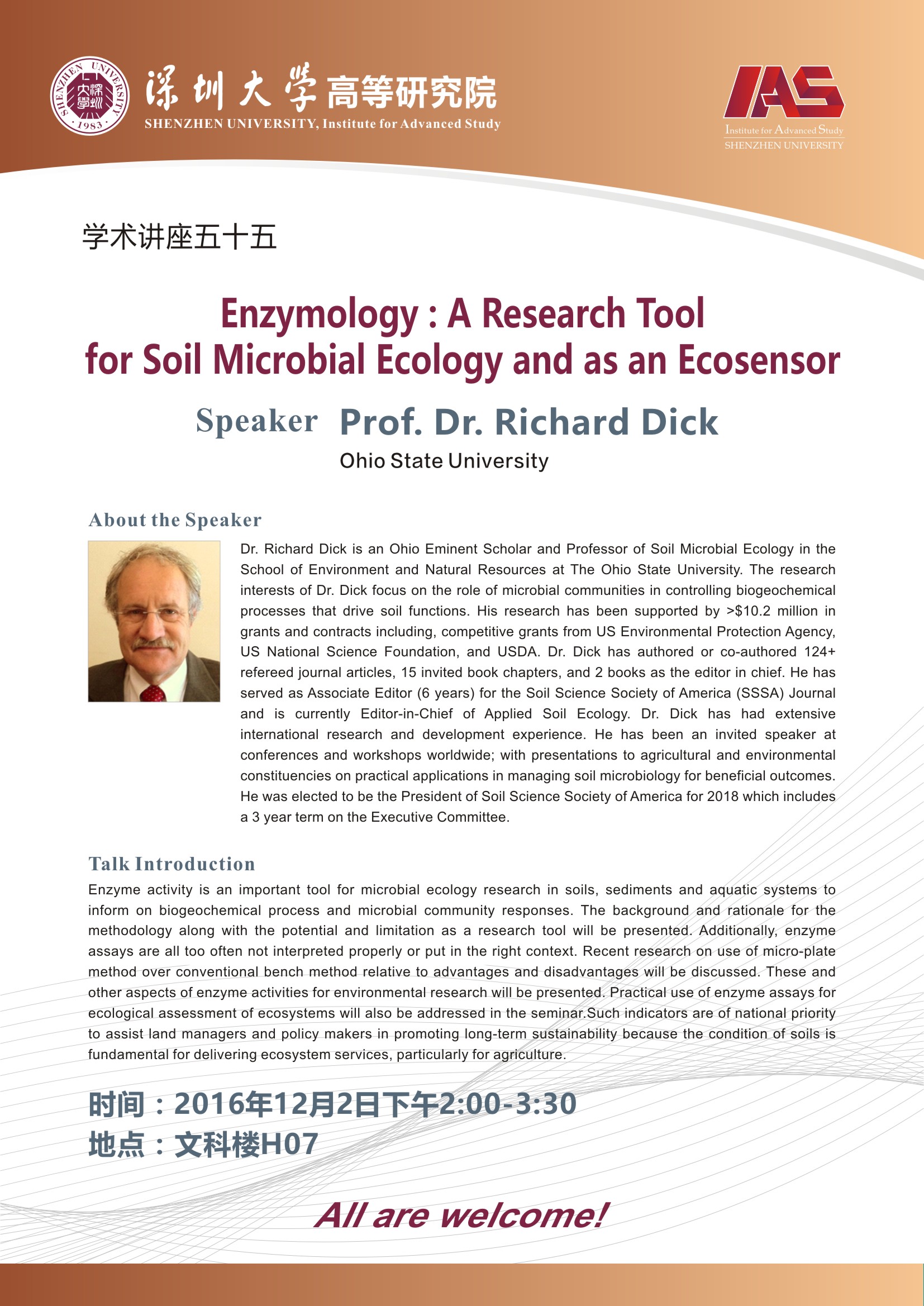 Dr. Richard Dick is an Ohio Eminent Scholar and Professor of SoilMicrobial Ecology in the School of Environment and Natural Resources at TheOhio State University. The research interests of Dr. Dick focus on the role ofmicrobial communities in controlling biogeochemical processes that drive soilfunctions. His research has been supported by >$10.2 million in grants andcontracts including, competitive grants from US Environmental ProtectionAgency, US National Science Foundation, and USDA. Dr. Dick has authored orco-authored 124+ refereed journal articles, 15 invited book chapters, and 2books as the editor in chief. He has served as Associate Editor (6 years) forthe Soil Science Society of America (SSSA) Journal and is currently Editor-in-Chiefof Applied Soil Ecology. Dr. Dick has had extensive international research anddevelopment experience. He has been an invited speaker at conferences andworkshops worldwide; with presentations to agricultural and environmentalconstituencies on practical applications in managing soil microbiology forbeneficial outcomes. He was elected to be the President of Soil Science Societyof America for 2018 which includes a 3 year term on the Executive Committee.