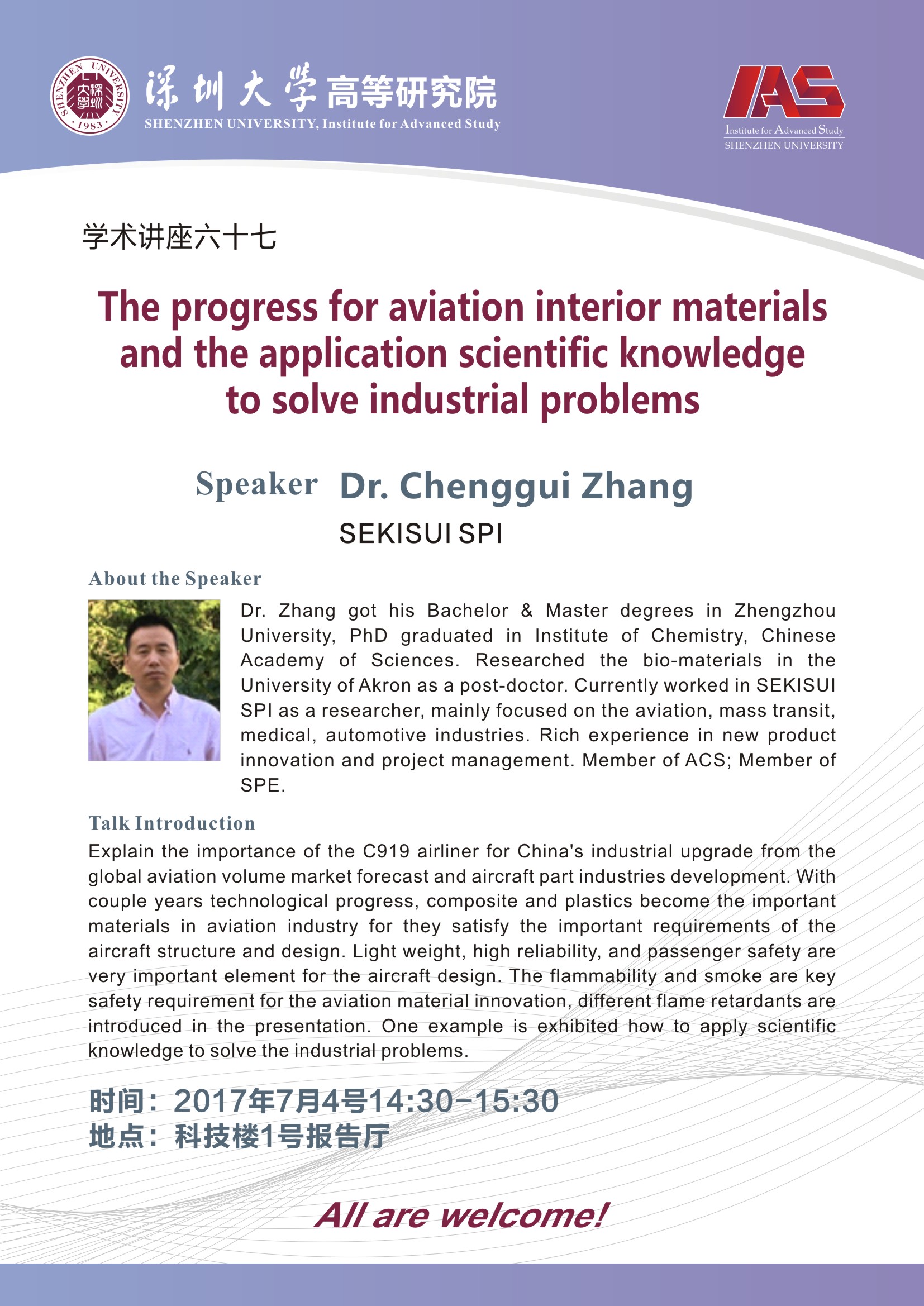 Explain the importance of the C919 airliner for Chinas industrial upgrade from the global aviation volume market forecast and aircraft part industries development. With couple years technological progress, composite and plastics become the important materials in aviation industry for they satisfy the important requirements of the aircraft structure and design. Light weight, high reliability, and passenger safety are very important element for the aircraft design. The flammability and smoke are key safety requirement for the aviation material innovation, different flame retardants are introduced in the presentation. One example is exhibited how to apply scientific knowledge to solve the industrial problems.