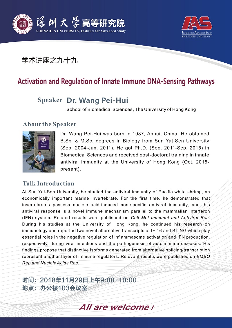 Dr. Wang Pei-Hui was born in 1987, Anhui, China. He obtained B.Sc. & M.Sc. degrees in Biology from Sun Yat-Sen University (Sep. 2004-Jun. 2011). He got Ph.D. (Sep. 2011-Sep. 2015) in Biomedical Sciences and received post-doctoral training in innate antiviral immunity at the University of Hong Kong (Oct. 2015-present).