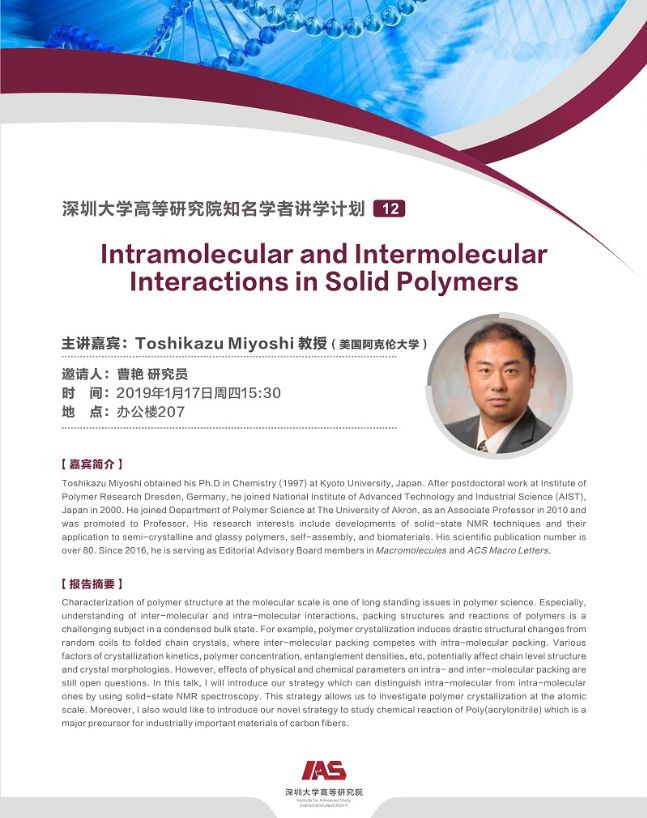 Toshikazu Miyoshi教授,1997年于日本京都大学获得化学博士学位,2000年在德国德累斯顿聚合物研究所(Institute of Polymer Research)从事博士后研究,后加入日本国家先进技术与工业科学研究所(National Institute of Advanced Technology and Industrial Science,AIST)。2010年起被聘为阿克伦大学高分子科学系副教授,并晋升为教授。Toshikazu Miyoshi教授的研究兴趣包括固态核磁共振技术的发展及其在半晶体和玻璃聚合物、自组装和生物材料上的应用。他的学术著作已超过80本。自2016年起,他担任Macromolecules和ACS Macro Letters的编委。