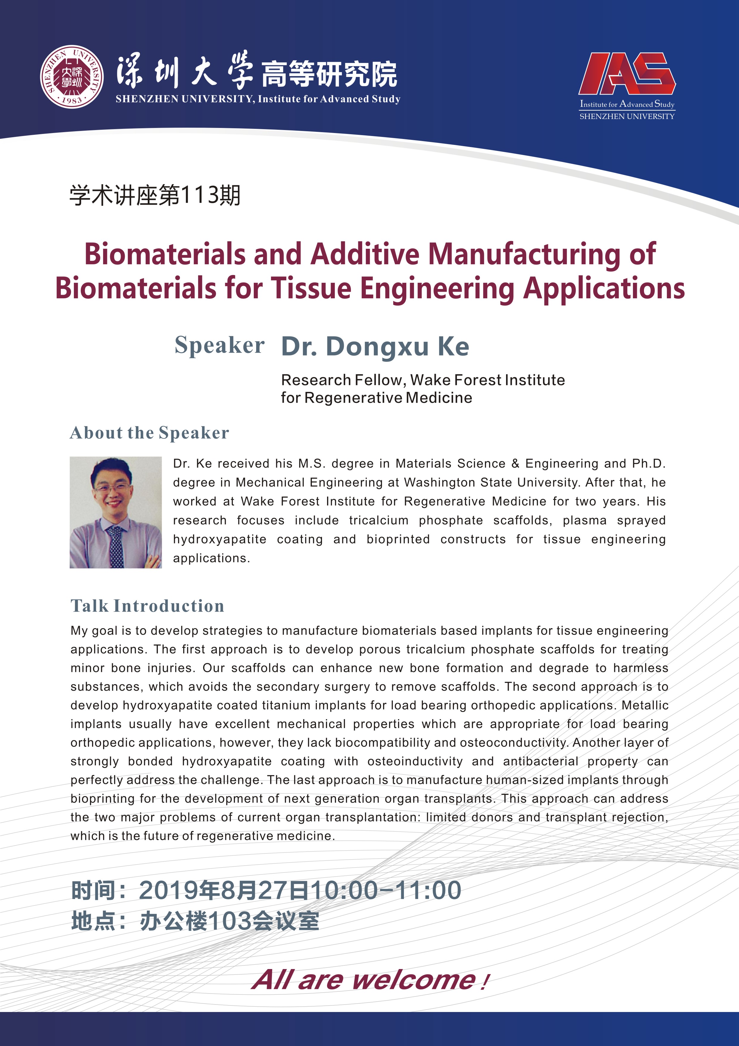 Dr. Ke received his M.S. degree in Materials Science & Engineering and Ph.D. degree in Mechanical Engineering at Washington State University. After that, he worked at Wake Forest Institute for Regenerative Medicine for two years. His research focuses include tricalcium phosphate scaffolds, plasma sprayed hydroxyapatite coating and bioprinted constructs for tissue engineering applications.