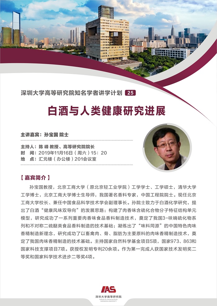 孙宝国教授,北京工商大学(原北京轻工业学院)工学学士、工学硕士,清华大学工学博士,北京工商大学博士生导师,我国著名香料专家,中国工程院院士。现任北京工商大学校长、兼任中国食品科学技术学会副理事长。孙院士致力于白酒化学研究,提出了白酒“健康风味双导向”的发展思路;构建了肉香味含硫化合物分子特征结构单元模型,研究成功了一系列重要肉香味食品香料制造技术,奠定了我国3-呋喃硫化物系列和不对称二硫醚类食品香料制造的技术基础;凝练出了“味料同源”的中国特色肉味香精制造新理念,研究成功了以畜禽肉、骨、脂肪为主要原料的肉味香精制造技术,奠定了我国肉味香精制造的技术基础。主持国家自然科学基金项目5项,国家973、863和国家科技支撑项目7项。获授权发明专利20余项。作为第一完成人获国家技术发明奖二等奖和国家科学技术进步二等奖4项。