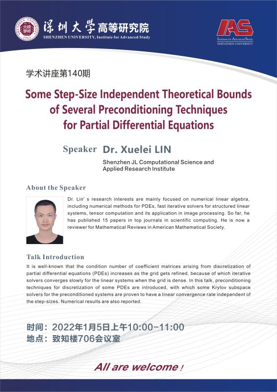 Dr. Lin’s research interests are mainly focused on numerical linear algebra, including numerical methods for PDEs, fast iterative solvers for structured linear systems, tensor computation and its application in image processing. So far, he has published 15 papers in top journals in scientific computing. He is now a reviewer for Mathematical Reviews in American Mathematical Society.