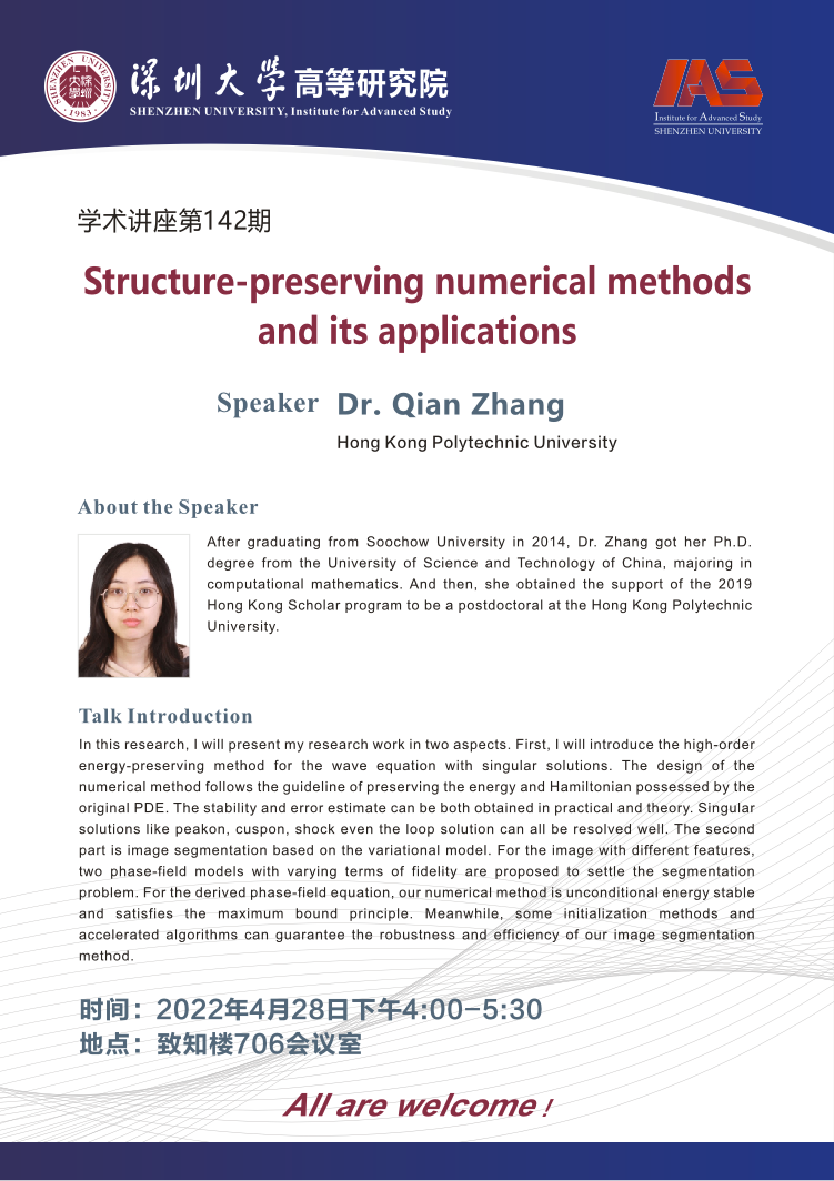 After graduating from Soochow University in 2014, Dr. Zhang got her Ph.D. degree from the University of Science and Technology of China, majoring in computational mathematics. And then, she obtained the support of the 2019 Hong Kong Scholar program to be a postdoctoral at the Hong Kong Polytechnic University.