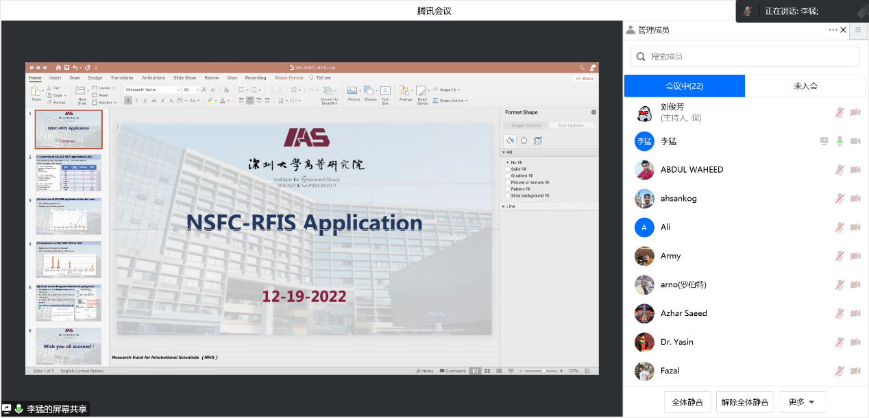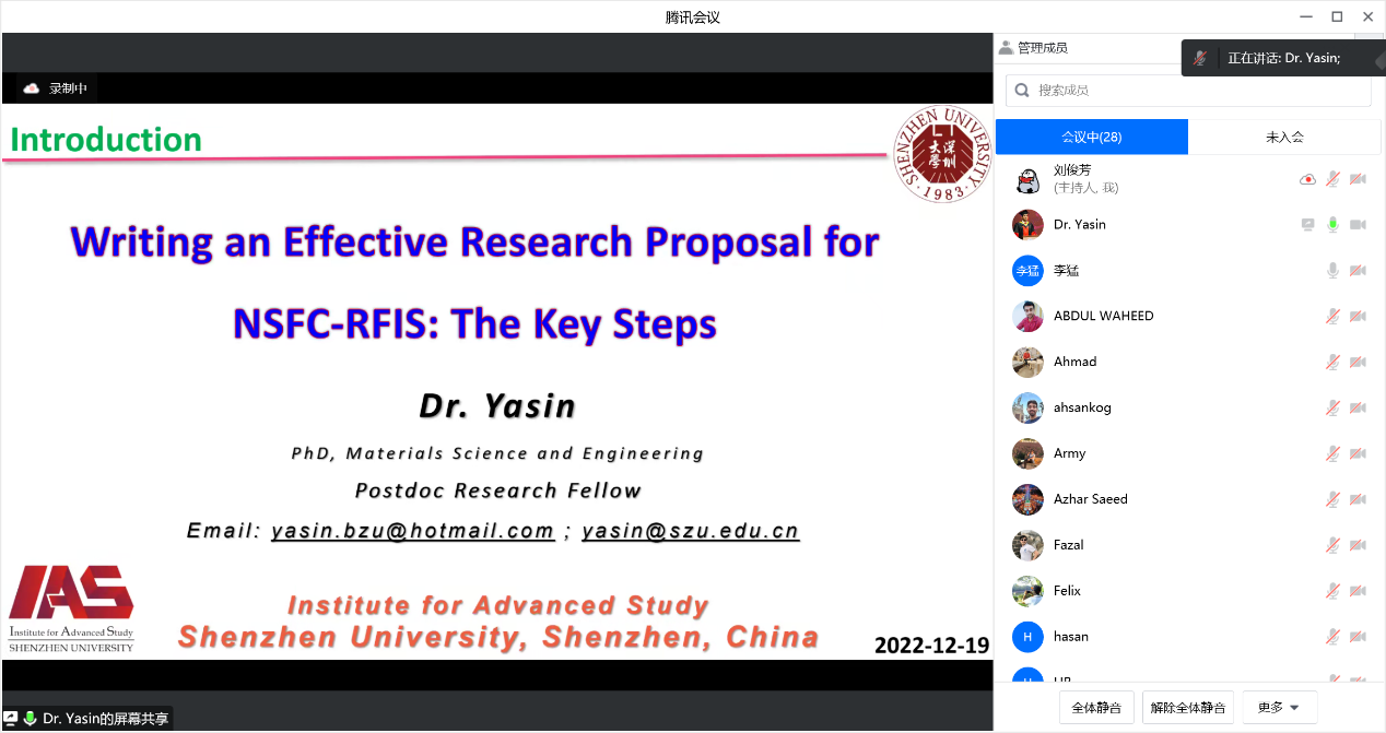 2022年12月19日下午,高等研究院成功召开国家自然科学基金外国学者研究基金项目申报线上交流会。会议由李猛副院长主持,邀请Fazal Mehmood Khan和Ghulam Yasin两位博士后为大家分享自己成功的经验,近三十名外籍学者参会。会上回顾了学院近年来外国学者研究基金项目的申报立项情况,也对学院外籍博士后提出了新的期许,鼓励外籍博士后申请外国学者研究基金,来年再创佳绩。