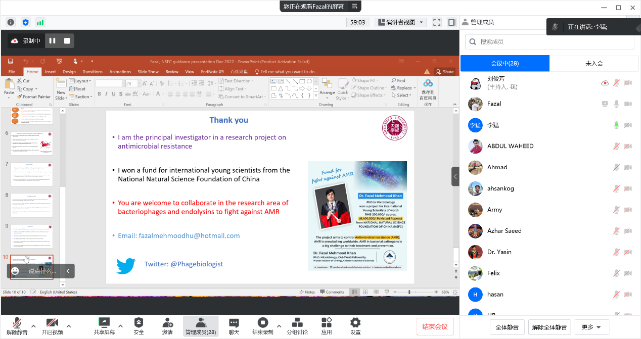 之后,Fazal Mehmood Khan博士首先分享,他的主题是A novel research proposal writing strategy for the NSFC funding project,他从研究题目、研究重要性和创新性、国内外背景和技术路线等角度系统分享了个人成功经验。