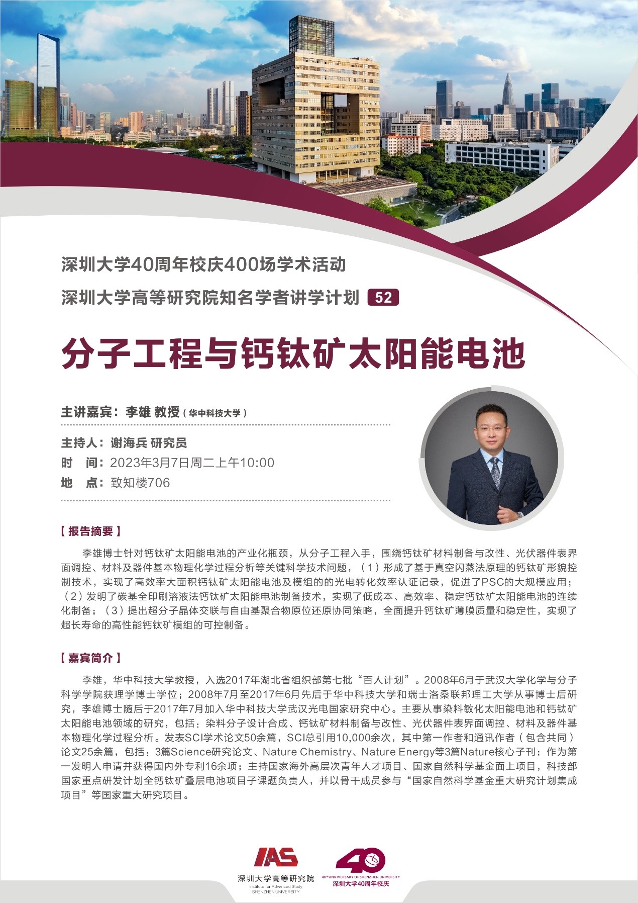 李雄,华中科技大学教授,入选2017年湖北省组织部第七批“百人计划”。2008年6月于武汉大学化学与分子科学学院获理学博士学位;2008年7月至2017年6月先后于华中科技大学和瑞士洛桑联邦理工大学从事博士后研究,李雄博士随后于2017年7月加入华中科技大学武汉光电国家研究中心。主要从事染料敏化太阳能电池和钙钛矿太阳能电池领域的研究,包括:染料分子设计合成、钙钛矿材料制备与改性、光伏器件表界面调控、材料及器件基本物理化学过程分析。发表SCI学术论文50余篇,SCI总引用10,000余次,其中第一作者和通讯作者(包含共同)论文25余篇,包括:3篇Science研究论文、Nature Chemistry、Nature Energy等3篇Nature核心子刊;作为第一发明人申请并获得国内外专利16余项;主持国家海外高层次青年人才项目、国家自然科学基金面上项目,科技部国家重点研发计划全钙钛矿叠层电池项目子课题负责人,并以骨干成员参与“国家自然科学基金重大研究计划集成项目”等国家重大研究项目。