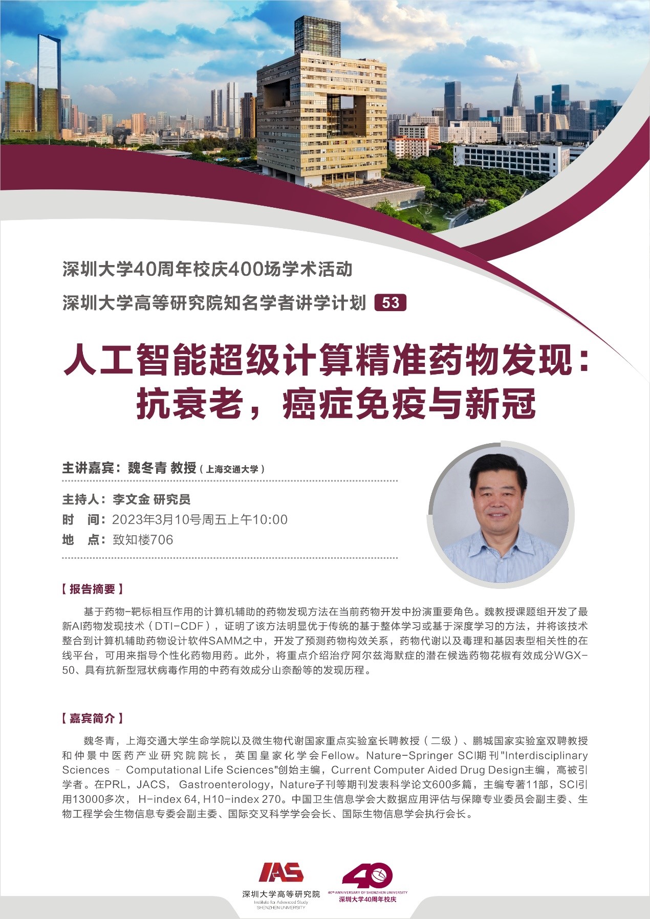 报告题目: 人工智能超级计算精准药物发现:抗衰老,癌症免疫与新冠
